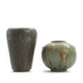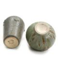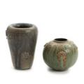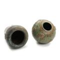 Kugleformet vase af stentøj, dekoreret med grøn/blå glasur med brune elementer, modelleret med blomster i relief. Sign. monogram. H. 9. Diam. 11.