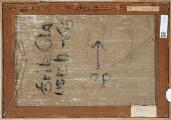 Flere krakeleringer samt afskalninger. Trykmærke øverst i lærredet.
