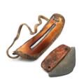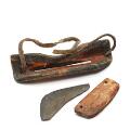 Greenlandic snow goggles of carved bone with fur and canvas trim, and slate ulu with walrus tusk grip. Early 20th century. L. 9–14 cm. (2)