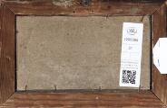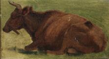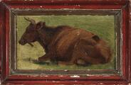 En liggende ko. Usigneret. Olie på papir monteret på malepap. Ca. 10×18 cm.