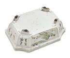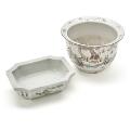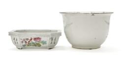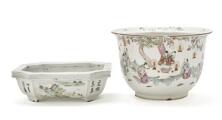 Kinesisk cachepot af porcelæn, dekoreret i emaljefarver med De Udødelige H. 15 cm Diam. 23 cm, samt en jardiniere 22×16,5 cm. Republik. (2)