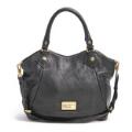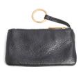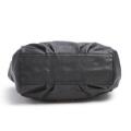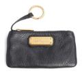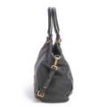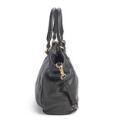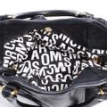 A set comprising of a bag of black leather with gold tone hardware, two handles, detachable and adjustable shoulder strap, one compartment with a magnetic closure, three interior pockets, one of which has a zipper, and white and black lining. As well as a matching wallet with a zipper and key chain. H. 29 x W. 38 x D. 13 cm and H. 8 x W. 14.5 x D. 1.5 cm. (2)