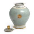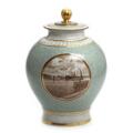 Porcelain vase and cover, decorated with crackle glaze and gold, front with round cartouche depicting Aarhus harbour with a floating dock, the back with logo of HN Aarhus (Hans Nielsen, Aarhus Floating Dock). With inscription under the base ‘From the employees of A.F.O.M.’ (Aarhus Flydedok og Maskin Compagni) and along the foot rim 1883–3 January - 1953. Royal Copenhagen. Mid-20th century. H. 42 cm.