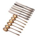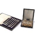 Et sæt på seks engelske smørknive med skafter af sterlingsølv og blade af sølvplet. Mester John & William Deakin, Sheffield. Samt et sæt på seks danske moccaskeer af forgyldt sølv. Mester A. Fieron. Vægt ca. 47 gr. 19. årh. (12)