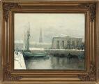 Vinterparti fra København med udsigt til Thorvaldsens Museum, i baggrunden Børsen. Sign. Otto Olsen. Olie på lærred. 29,5×37,5 cm.