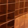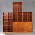 Reolvæg af mahogni bestående af to skabe, fem bogkassser samt tre sokler. Udført hos Rud. Rasmussens snedkerier, København. Skabe: H./B. 76. D. 36. Bogkasser: H./B. 76. D. 27,5. To sokler: H. 5. B. 76. D. 36. En sokkel: H. 5. B. 76. D. 27,5. (10)