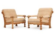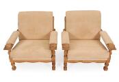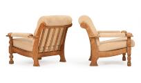 A pair of solid oak easy chairs, upholstered with light brown alcantara. 1970s. (2)