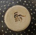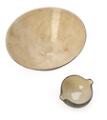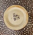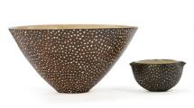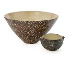 Two earthenware bowls, the inside decorated with transparent glaze. The outside with resp. reddish brown and black glaze with greyish white dots. Signed monogram 13. Unique. H. resp. 7 and 15.3 cm. Small bowl: W. incl. spout 13 cm. Large bowl: Diam. 29.5 cm. (2)