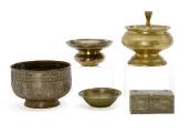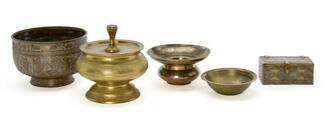 A group of cairoware comprising of spitoon, casket, two bowls and covered bowl. 19/20th century. H. 4–13 cm. (5)