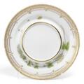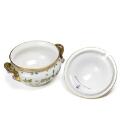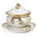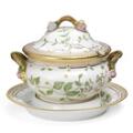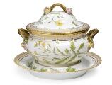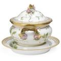 “Flora Danica” porcelain tureen and stand decorated in colours and gold with flowers, finial and handles in the shape of a twisted twigs adorned with repoussé flowers. 3562 and 3563. Royal Copenhagen. Dish Diam. 33 cm. Tureen Diam. 30 cm.