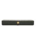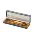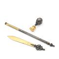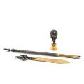 Fransk skrivesæt af forgyldt og patineret bronze, bestående af segl, brevåbner og fyldepen. I tilhørende æske beklædt med guldpræget, grønt skind, indvendigt beklædt med velour. Mrk. Depossé. 19. årh.s slutning. L. 5–17.