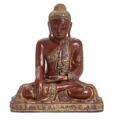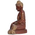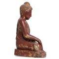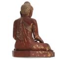 Burmesisk Buddha af rødlakeret træ, prydet med spejlflusser. Ca. 1900. H. 51 cm.