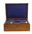 Items with engravings. Wear due to age and use. Box with cracked lid.