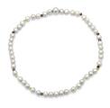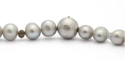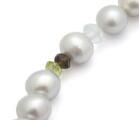 A globe claps of 14k white gold. Accompanied by a pearl necklace set with numerous fresh water pearls and faceted beads of amethyst, peridote and smoky quartz among others. Clasp diam. 10 mm. Pearl diam. app. 7–8 mm. L. 43 cm. (2)