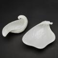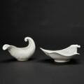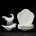 “Hvid Konkylie”. Middagsservice af porcelæn, dekoreret med klar glasur. Bestående af fem middagstallerkner, 624, en asiet, 647, samt en saucekande, 14192. Tryksign. monogram. Kgl. P. Middagstallerkner: Diam. 25. Asiet: H. maks. 8,7. L. 24. Saucekande: H. 12,5. L. 19,5. (7)