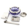 To cigaretetuier, det ene med pånittet monogram, det andet med Christian X's emblem og askebæger af hammerslået sølv. Vægt ca. 345 gr. Samt cigarklipper med kappe af sterlingsølv og askebæger af blåt krystalglas med sterlingsølvmontering. Bl.a. Danmark og Tyskland. 20. årh. Cigaretetuier 11,5×8,5 og 10×8. Askebæger H. 2. Diam. 8. Krystalaskebæger H. 6. Diam. 15,5. (5)