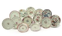 A collection of Chinese famille rose and a few Imari export porcelain plates, of which three pairs and a set of three. Qianlong 1736–1795. Diam. 23–24 cm. (20)