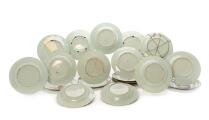 Wear due to age and use. Most plates with chips along edges, some with cracks others with through-going cracks and posiibly repairs.