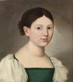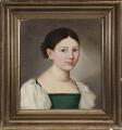 Portræt af en ung kvinde i en grøn kjole med hvide silkeærmer. Usigneret. Olie på lærred. 31×28,5 cm.