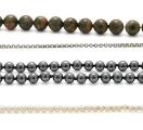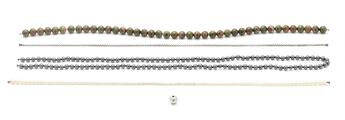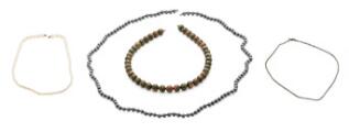 A clasp of 14k satinated white gold. Accompanied by a sterling silver necklace and 3 necklaces set with cultured pearls, hematite and jaspis, all with Lynggaard ends. Clasp weight app. 3 g. Diam. 10.7 mm. Necklaces L. 42–85 cm. (5)