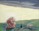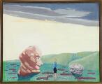 Surrealistisk landskab. Sign. v.b.p. 36. Olie på lærred. 60×74.
