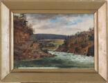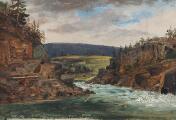 “Steinfos”, norwegian river landscape with grey clouds in the sky. Signed Zeuthen 1845, Steinfos. Oil on cardboard, laid on wood. 13.5×19.5 cm.