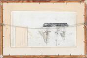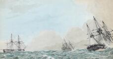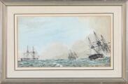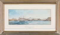 To kompositioner med orlogsskibe. Usignerede. Vandfarve, tusch og blyant på papir. Ene værk betegnet “Porto Praya, Cape Verde Islands, c. 1851”. Det andet med recto et verso. Lysmål 10,5×28 og 17×30. (2)