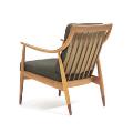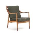 An oak easychair with teak armrests and shoes, loose epeda cushions in seat and back with dark green/light green wool. Model FD 144. Designed 1953. Manufactured by France & Daverkosen/France & Son.