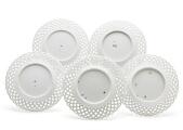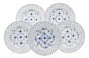 “Musselmalet Helblonde” sæt på fem frugttallerkener af porcelæn, dekoreret i underglasur blå, bred gennembrudt kant. Royal Copenhagen, 1800–1900. Diam. 23,5 cm. (5)