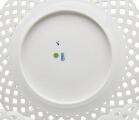 Dette lot er et fint eksempel på udviklingen af Musselmalet mønstret, porcelænets farve samt dybden i den blå farve. Én tallerken dekoreret af blåmaler Hans Jacob Hansen, virksom 1779–1819, dette eksemplar er malet før 1810.