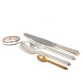 Bestående af: 6 luncheon knives, 6 luncheon forks, 6 dessert spoons, 6 coffee spoons goldplated, 1 napkin ring.