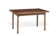 Rectangular Cuban mahogany dining table with underlying pullout leaves and profiled legs. Made 1930s by Rud Rasmussen cabinetmakers, Copenhagen, with paper label. H. 77 cm. L. 138./200./262 cm. W. 93 cm.