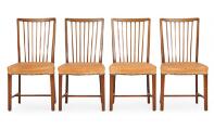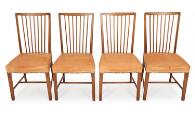 Et sæt på fire stole af bejdset bøg, sæder betrukket med sømbeslået patineret naturskind. 1940'erne. (4)