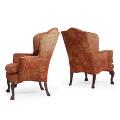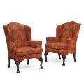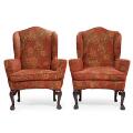 A pair of English Georg III style Wingback dark polished wood chairs, upholstered with red velour with flower motifs, carved with cabriole legs on 'Claw and ball' feet. 20th century. (2)