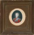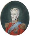Miniature portrait of King Frederik VI of Denmark (1768–1839). Unsigned. Handcoloured lithograph laid on board. Sheet size 9×7.5 cm. In circular passepartout and four-sided Damborg-frame with label.