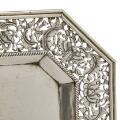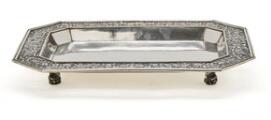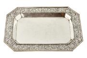 Kinesisk eksportsølv salver, rektangulær form med indtrukne hjørner, gennembrudt fane med sommerfugle og bladslyng, hævet på fire lave fødder udformede som tempelløver. Stemplet Hui Yuan, Hong Kong, 19. årh.s slutning. Vægt 692 g. 28,5×21 cm.