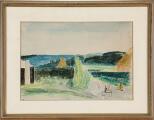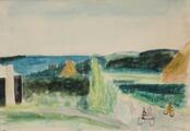 Fjordparti, 1942. Sign. Jens Søndergaard, 1942. Akvarel på papir. Lysmål 34×49.