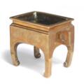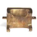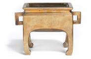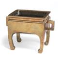 A Chinese bronze incense burner of rectangular form raised on four integrated legs with scrolled ends. Twin sharp-edged handles. Qing dynasty 18th century. Weight 1826 g. H. 12.5 cm W. 13 cm D. 9.5 cm. L. including handles 17.5 cm.