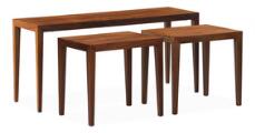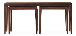 Tre indskudsborde af palisander, bestående af et langt og et par mindre borde. Model 41A og 41B. Udført og mærket hos Haslev Møbelsnedkeri. H. 50. L. 109,5. B. 35,5. og H. 45. L. 47. B. 35,5. (3)