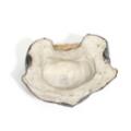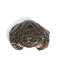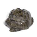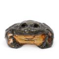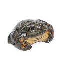 Figur af stentøj modelleret i form af tudse. Dekoreret med mørke grønne og brune glasurer, samt med sandfarvet glasur. Sign. monogram, 1911. Udført og sign. hos Bing & Grøndahl. Unik. H. 6,5. B. 13. D. 11,5.