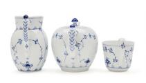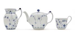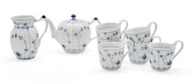 Musselmalet Riflet" tekande 142, mælkekande 442 og seks krus090 af porcelæn, dekoreret i underglasur blå. Royal Copenhagen. (8)