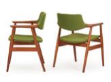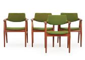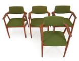 Et sæt på fire armstole af teak, betrukket i sæde og ryg med grønt uld. Udført hos Glostrup Møbelfabrik. (4)