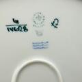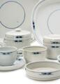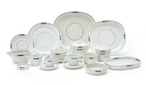 Bestående af: 17 middagstallerkener (14608) diam. 26., 6 middagstallerkener (14612) diam. 23,5., 5 dybe tallerkener (14607) diam. 21,5., 3 frokosttallerkener (14613) diam. 22., 5 desserttallerkener (14615) diam. 17,5., 8 kagetallerkener (14616) diam. 15,5., 2 fade (14617) L. 35., 2 store fade (14618) L. 18,3., 3 asietter (14619) diam. 8., 2 flaskebakker (14601) diam. 13,3., 1 saucekande (14603), 2 fade med høj kant (14628) L. 24., 7 kaffekopper med 15 underkopper (14622), 1 tekop med 4 underkopper (14634), 3 espressokopper med 5 underkopper (14637), 1 lågskål (14623), 1 smørdåse underdel (14624) diam. 11., 1 krukke (14625) B. inkl. hanke 14., 1 flødekande (14626), 1 sukkerskål (14627).