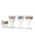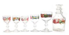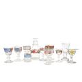 Collection of glassware decorated with rose painting, several with motto in cartouche, consisting of carafe, sugar dish on inverted baluster-shaped stem, low goblet and eight stemmed glasses in varying sizes. Also included is a glass with a hollow stem on a curved foot. 19th century. H. 6–16 cm. (12)