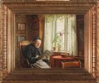Interiør med en ældre kvinde. Sign. KJ. Olie på malepap. 26×33.