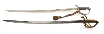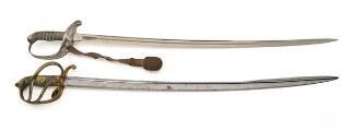 Danish commander sergeant sabre M/1854 with approx. 75.5 cm. long pipe backed blade with yelman indistinctly marked P. D. LüNESCHLOSS on one side and IN SOLINGEN on the other in its leather scabbard with two fittings and a Danish infantry officer sabre M/1905 with approx. 77 cm. long nickel-plated blade marked C. L. SEIFERT KGL. HOF GULDTRÆKKER KJØBENHAVN in nickel-plated iron scabbard with a single carrying ring mounted with a shield for the Shooting School.