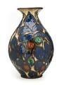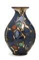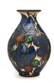 Gulvvase af lertøj dekoreret med hornglaserede blade og bær i mørkeblåt, brunt og grønt på lys bund. Sign. HAK. Udført hos Kähler. H. 42,5. Diam. ca. 29 cm.