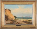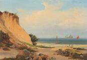 Udsigt langs sjællandsk kyst mod en stejl skrænt med skibe på havet. Sign. Nordahl Grove 54. Olie på lærred. 26×37.
