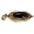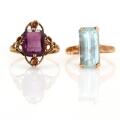Smykkesæt af 14 kt. guld bestående af to ringe prydet med henholdsvis akvamarin, ametyst og vedhæng prydet med cabochonslebet onyx. L. 4,5 cm. Str. 55. (3)