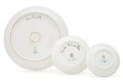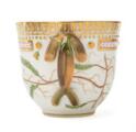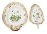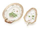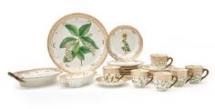 “Perlestellet” kaffeservice af porcelæn, dekoreret i farver og guld med blomster i Flora Danica manér. Bestående af seks par små kaffekopper, to asietter, rundt fad og seks kagetallerkener. Royal Copenhagen. (15)